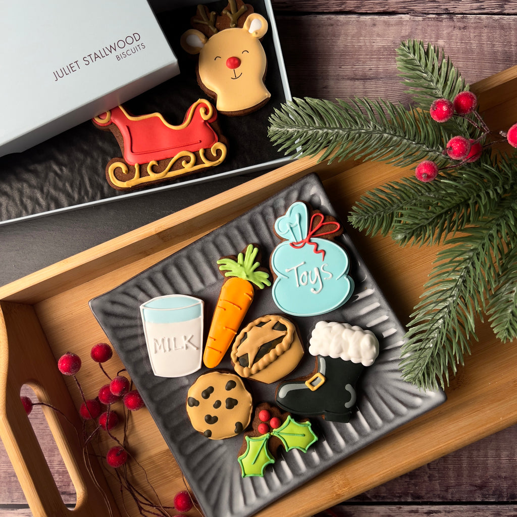 🛷 This set features biscuits in the shapes of Santa's boot, Rudolph, milk, toy sack, cookie, carrot, holly, mince pie & Santa's sleigh.