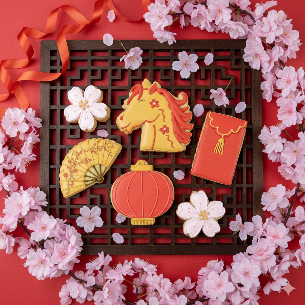 🐴 Features biscuits in the shapes of a horse head, 2 blossoms, fan, money envelope and lantern.